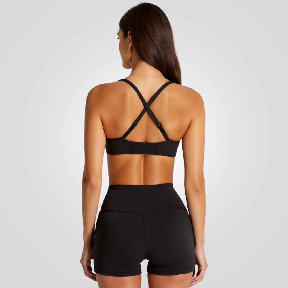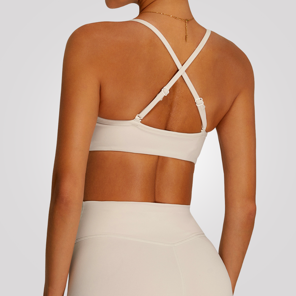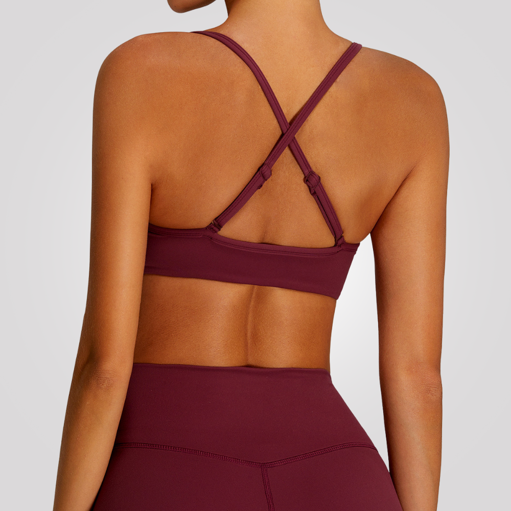 Brassière de sport à maintien modéré avec bretelles réglables, coussinets amovibles et dos croisé, conçue pour offrir ajustement, confort et liberté de mouvement lors d’activités douces à modérées.